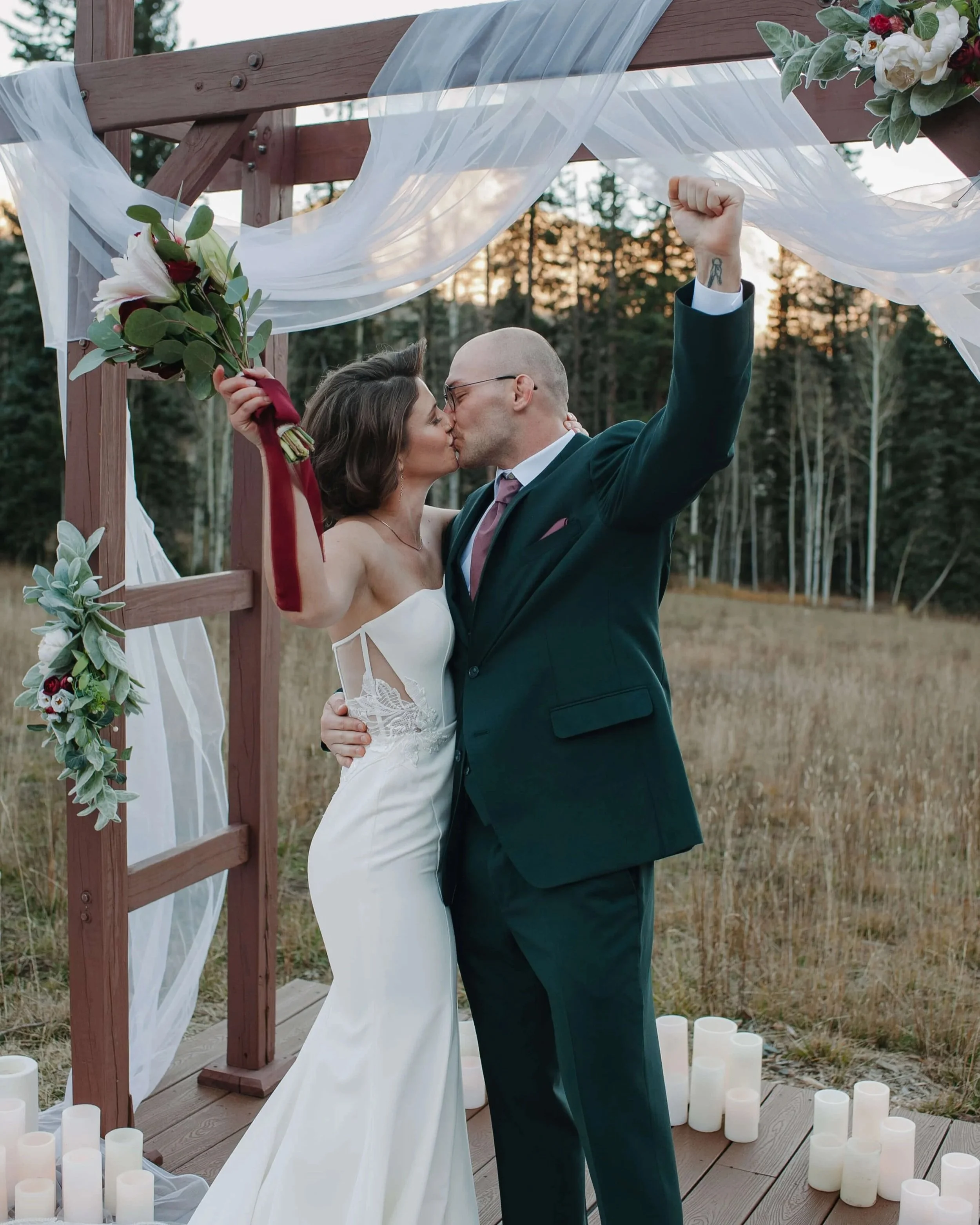 Instead of leaning into bold trends or an overdone winter look, the design focused on rich, timeless textures and color. Deep maroons and layered greens set the tone, softened by abundant candlelight and florals that brought warmth into the space. Velvet accents and lush fabrics added depth without overpowering the setting, creating an atmosphere that felt both cozy and refined. The overall vibe was intimate, romantic, and thoughtfully curated. With a versatile, understated design that allowed each element to stand on its own. Resulting in a space that felt elevated, personal, and effortlessly winter chic.